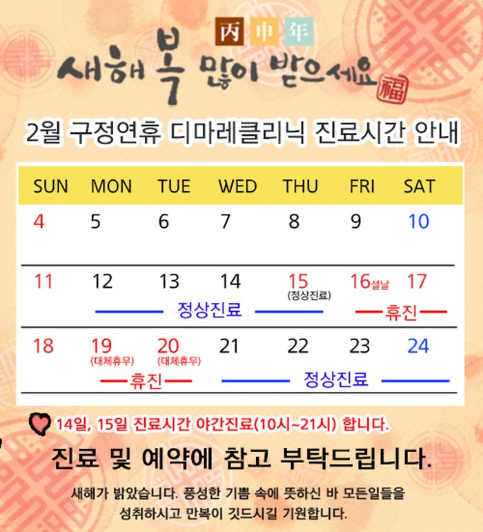 저희 디마레 클리닉의 2월 구정연휴안내 드립니다. ^^