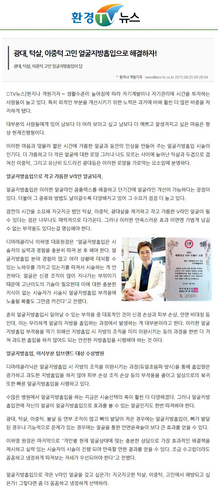 광대, 턱살, 이중턱 고민 얼굴지방흡입으로 해결하자!2015. 08. 07. 디마레클리닉 얼굴지방흡입 기사안내다음글[뷰티]'동안' 열풍의 이슈, 얼굴지방이식은?이전글대한민국 상위 1%의 美를 만드는 미용성형의 명의 16 자가지방이식 부문 저자 참여목록